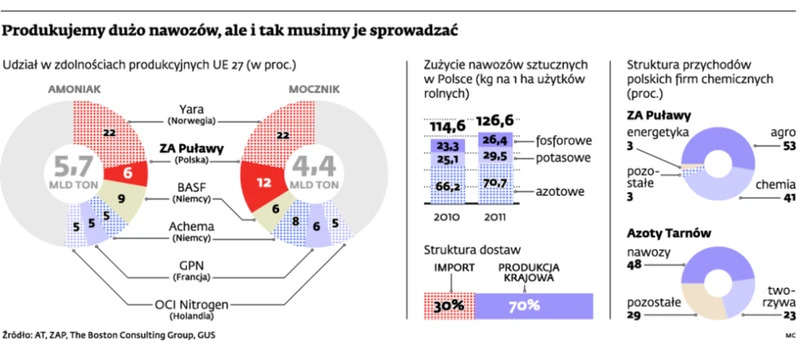 A Polska to bardzo atrakcyjny rynek dla producentów nawozów – jeden z liderów pod względem wielkości obszarów rolnych w Europie, gdzie popyt na nawozy stale rośnie. Ich zużycie w 2011 r. wyniosło 1,95 mln ton, o 10 proc. więcej niż rok wcześniej. Nic dziwnego, że nasz rynek penetrują duzi zagraniczni producenci – choćby BorsodChem (od ponad roku część chińskiej grupy Wanhua) czy norweska Yara. Nie jest tajemnicą, że najmocniej zęby ostrzy sobie jednak Gazprom i spółki z nim powiązane. Zainteresowanie wschodnich sąsiadów nie dziwi. – Choć mamy drogi gaz, to nasza konkurencyjność wciąż jest duża. Nasze instalacje zużywają jedynie 845 m sześc. gazu na tonę amoniaku, podczas gdy rosyjskie ponad 1000 m sześc. – wyjaśnia Wojciech Kozak.