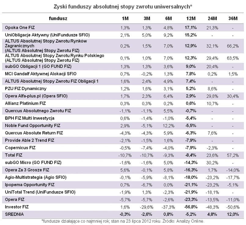 Obecnie, wg klasyfikacji serwisu Analizy Online, krajowe towarzystwa funduszy inwestycyjnych oferują 31 funduszy absolutnej stopy zwrotu uniwersalnych, z czego dziesięć istnieje dłużej niż trzy lata (prawdziwy ich wysyp nastąpił po wybuchu kryzysu i załamaniu na rynkach akcji). Ponad jedna trzecia z nich działa w formule funduszu zamkniętego (FIZ), a pozostałe są funduszami otwartymi (FIO lub SFIO). Porównując ich dotychczasowe osiągnięcia, siłą rzeczy trzeba się skupić na krótszych okresach czasu.