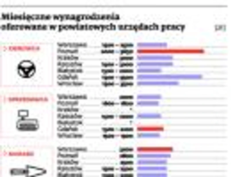 Nieco lepiej opłacani są kierowcy tirów. Wrocławscy mogą liczyć na 3,5 tys. zł miesięcznie, pod warunkiem że zgodzą się jeździć na trasie Polska – Włochy. Z kolei w Poznaniu jest oferta za 5,6 tys. zł dla kierowcy autocysterny skłonnego jeździć do Belgii i Włoch.