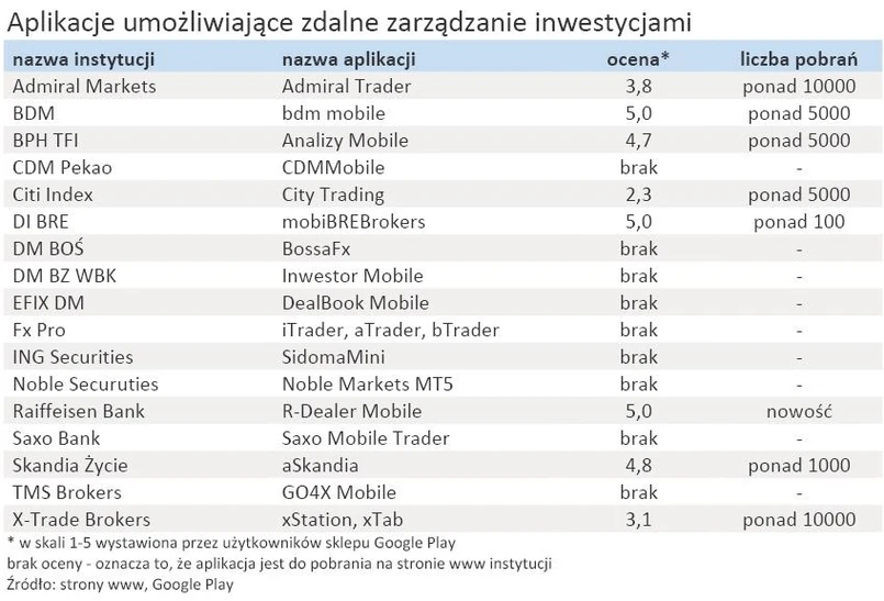 Najwięcej pobrań – ponad 10 tys. – zanotowały aplikacje Admiral Markets oraz X-Trade Brokers, pozwalające na inwestowanie w indeksy, surowce i waluty. Nowością jest R-Dealer Mobile, aplikacja Raiffeisen Banku pozwalająca na handel walutami.