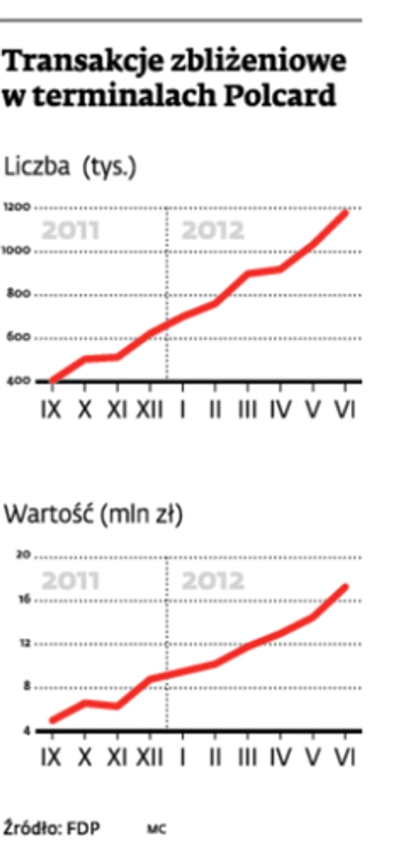 Do First Data Polska należy ok. 13 tys. terminali działających w technologii zbliżeniowej pod marką Polcard. W czerwcu obsłużyły one niemal 1,2 mln transakcji bezstykowych. Cały rynek to ok. 70 – 80 tys. takich urządzeń. Zakładając, że transakcyjność w urządzeniach pozostałych agentów jest porównywalna, można szacować, że w czerwcu Polacy pobili zbliżeniowy rekord Europy. Nawet w Wielkiej Brytanii, gdzie kart zbliżeniowych i terminali jest więcej niż u nas, transakcji było mniej. Visa już od kilku miesięcy raportuje, że Polska wyrasta na europejskiego lidera w rozwoju rynku kart zbliżeniowych. Plastikami z logo tej organizacji w maju nasi rodacy zapłacili 3,3 mln razy.