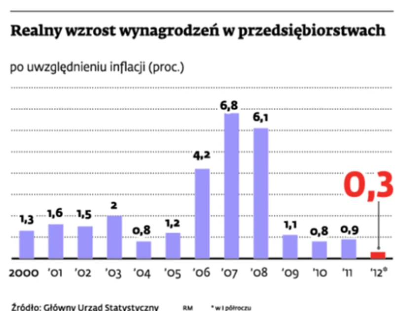 Niezależnie od tego, kto ma rację, jedno jest pewne – tak słabo nie było od 20 lat. W 1992 r. realne pensje w przedsiębiorstwach skurczyły się o 3,6 proc., ale od tamtej pory nieustannie pięły się w górę. W szczytowych momentach, jak w 2007 r., aż o 6,8 proc. Najsłabsze były lata 2004 oraz 2010, gdy wynagrodzenia urosły – uwzględniając inflację – o 0,8 proc.