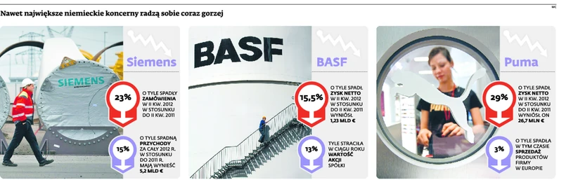Problemy chińskiej gospodarki coraz mocniej odczuwają niemieckie koncerny. Tylko w ostatnich dniach największa firma chemiczna świata BASF podała, że jej zamówienia w II kwartale spadły o prawie 25 proc.; największa grupa elektromaszynowa Europy Siemens zredukowała o 10 proc. spodziewane na ten rok przychody, a trzeci co do wielkości dostawca sprzętu sportowego Puma zredukował aż o 29 proc. zyski netto za II kw. I każda jako jedną z głównych przyczyn gorszych wyników podaje spadek sprzedaży w Chinach.