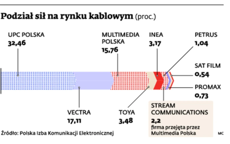Analitycy za faworyta uważają UPC Polska, który przejęcie Multimediów traktuje jako kolejny etap konsolidacji rynku. Pierwszy krok w tym kierunku amerykańska firma zrobiła w ubiegłym roku, przejmując Grupę Aster. Dzięki temu liczba jej klientów wzrosła do 1,5 mln. UPC Polska twierdzi, że zwiększanie skali działania to jedyny sposób, by sprostać konkurencji przede wszystkim Orange Polska. Po połknięciu Multimediów liczba klientów operatora przekroczyłaby 2,3 mln. Jak to wpłynie na rynek?