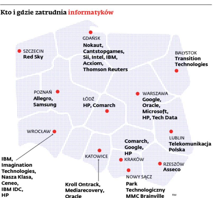 Niedługo jednak na tej mapie mogą zajść spore zmiany. Bo zdaniem ekspertów największy potencjał drzemie na wschodzie Polski. Choć dziś jest on informatyczną pustynią, to w niedługim czasie może ona zostać zagospodarowana. Wszystko dzięki temu, że koszty pracy są niższe, a za to coraz prężniej działają ośrodki kształcące przyszłych specjalistów IT. Jest politechnika w Rzeszowie i Białymstoku, informatyków szkoli uczelnia w Siedlcach. Tu też część uczelni otrzymała od Ministerstwa Nauki wsparcie finansowe, na wielu uczelniach kierunki informatyczne uzyskały status zamawianych (na nich najlepsi studenci otrzymują stypendia w wysokości 1 tys. zł). W Rzeszowie działa firma Asseco, a w Białymstoku zatrudnia polska firma Transition Technologies, specjalizująca się w oprogramowaniu dla sektora przemysłowego.