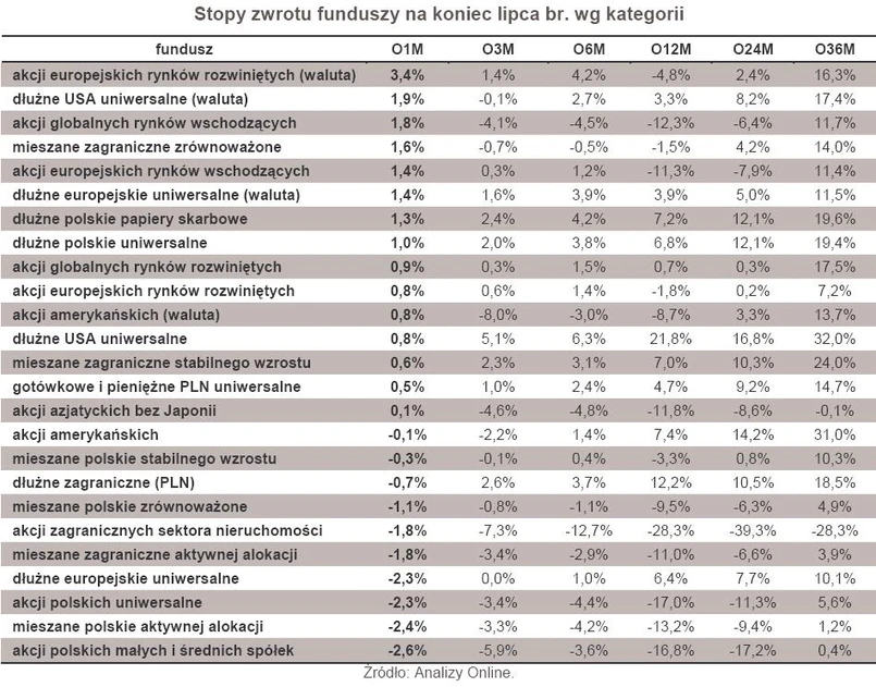 Lipiec obfitował jednak także w dobre informacje dla uczestników funduszy inwestycyjnych. Powody do zadowolenia mogą mieć na pewno posiadacze funduszy polskich obligacji, zwłaszcza tych, które inwestują w papiery skarbowe. Poszukiwanie bezpiecznego azylu przez kapitał zagraniczny sprawiło, że rentowność naszych benchmarkowych obligacji dziesięcioletnich zeszła poniżej poziomu 5 proc., nie oglądanego od kilku lat. Dla posiadaczy jednostek funduszy dłużnych, zaangażowanych polskie obligacje skarbowe, oznacza to spore zyski. Tylko w jednym miesiąca średni wzrost ich wartości wyniósł 1,3 proc., przy czym zyski kilku najlepszych przekroczyły nawet 2 proc. Nieco słabiej poradziły sobie fundusze papierów dłużnych uniwersalne – średnia plus 1 proc. Niemniej, w obydwu przypadkach należy uznać to za bardzo dobre wyniki. Porównywalne zyski ostatni raz te fundusze notowały w styczniu br., zaś ich tegoroczne średnie zyski przekraczają już 5 proc.