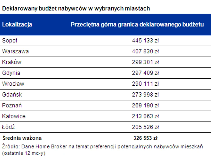 Zgodnie z danymi Home Broker nabywcy, którzy znają swoje możliwości finansowe oraz sytuację na rynku chcieli w ostatnich 12 miesiącach wydać na mieszkanie średnio 327 tys. zł. Co ciekawe, zestawienie deklarowanego budżetu otwiera Sopot z wynikiem na poziomie 445 tys. zł. Warszawa zajęła drugą lokatę z wynikiem 408 tys. zł. Na podium swoje miejsce znalazłby też Kraków, przy czym wynik na poziomie 299 tys. zł jest zbliżony do budżetów deklarowanych w Gdyni (297 tys. zł) i Wrocławiu (290 tys. zł). Najmniejszy budżet na zakup mieszkania deklarują natomiast nabywcy szukający własnego „M” w Łodzi i Katowicach. Na ten cel nabywcy chcą tam wydać odpowiednio 206 i 213 tys. zł.
