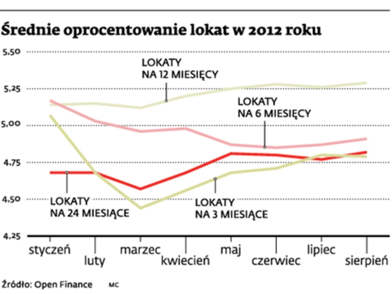 Nie zmienia to jednak faktu, że dziś średnie oprocentowanie lokat sześciomiesięcznych i rocznych wciąż przewyższa odsetki, jakie banki płacą klientom zdecydowanym postawić na lokaty o dwuletnim okresie zapadalności. Na półrocznych depozytach można zarobić średnio 4,91 proc. w skali roku, na rocznych 5,29 proc., a na 24-miesięcznych jedynie 4,82 proc. Gorzej pod tym względem wypadają jedynie trzymiesięczne lokaty, których średnie oprocentowanie wynosi 4,79 proc.