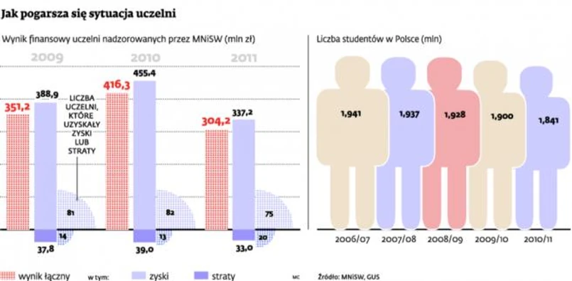 Wyjątkowo złą sytuację finansową ma Uniwersytet Łódzki. Podczas gdy w 2010 r. była na 1,5 mln zł plusie, w 2011 r. miała 3 mln zł straty. Politechnika Radomska jest do tyłu o 4 mln zł. Nawet tym uczelniom, które jeszcze zarabiają, wiedzie się gorzej. Uniwersytet Szczeciński w 2010 r. miał zysk 4,5 mln zł, rok później tylko 27 tys. zł. Politechnika Koszalińska w 2011 r. zarobiła 160 tys. zł, a jeszcze dwa lata wcześniej miała 4 mln zł zysku. Politechnice Warszawskiej zyski spadły w rok o 6 mln zł.