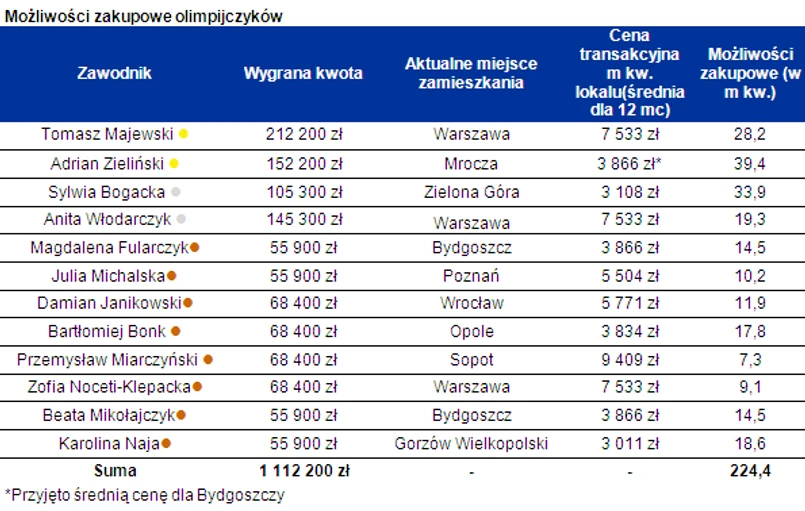 Złoto Adriana Zielińskiego i srebro Sylwii Bogackiej to najcenniejsze polskie medale olimpijskie jeśli przeliczyć otrzymane przez sportowców nagrody pieniężne na ceny nieruchomości w miejscowościach, w których mieszkają. Medaliści mogliby za wypłacone pieniądze z powodzeniem kupić kawalerki. Tomasz Majewski, choć na olimpiadzie „zarobił” najwięcej, z racji tego, że mieszka w drogiej Warszawie, mógłby kupić mieszkanie najwyżej 28-metrowe.
