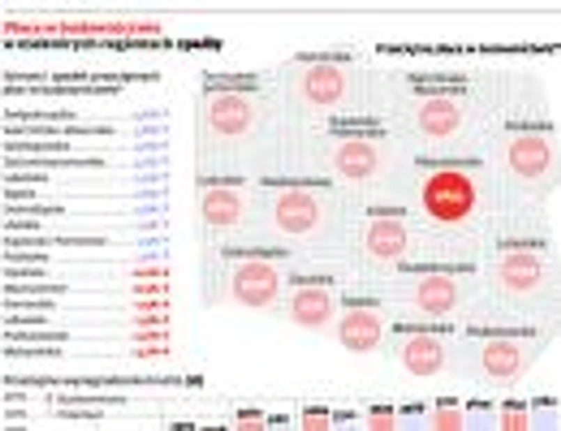W tym roku, po raz pierwszy od pięciu lat, wynagrodzenia w budownictwie są niższe niż w przemyśle. W pierwszym półroczu średnia płaca brutto w tej branży wyniosła 3633 zł i była zaledwie o 1,4 proc. wyższa niż przed rokiem. Natomiast w przemyśle średnie wynagrodzenie osiągnęło poziom 3762 zł i wzrosło o 5,1 proc. W tym czasie inflacja wyniosła 4 proc. – wynika z danych GUS. Po jej uwzględnieniu okazuje się, że siła nabywcza wynagrodzeń pracowników firm budowlanych spadła w ciągu roku o 3,5 proc., a w przemyśle zwiększyła się o 1 proc. To jednak średnia dla całego kraju. Jeśli jednak przyjrzymy się sytuacji w poszczególnych regionach, to zobaczymy, że w wielu jest znacznie gorsza. W budownictwie w woj. małopolskim na przykład spadły nawet nominalne wynagrodzenia – o 3,7 proc. Obniżyły się one również w granicach od 0,3 proc. do 2,2 proc. w pięciu innych województwach: lubuskim, mazowieckim, opolskim, podkarpackim i pomorskim.