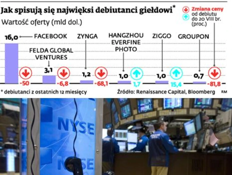 Papiery Facebooka zostały od momentu majowego debiutu przecenione o połowę. Jeszcze więcej stracili udziałowcy producenta gier, firmy Zynga (blisko 70 proc.), czy internetowego dystrybutora kuponów zniżkowych, spółki Groupon (nieco ponad 80 proc.). Dwie ostatnie spółki debiutowały jeszcze w ubiegłym roku.