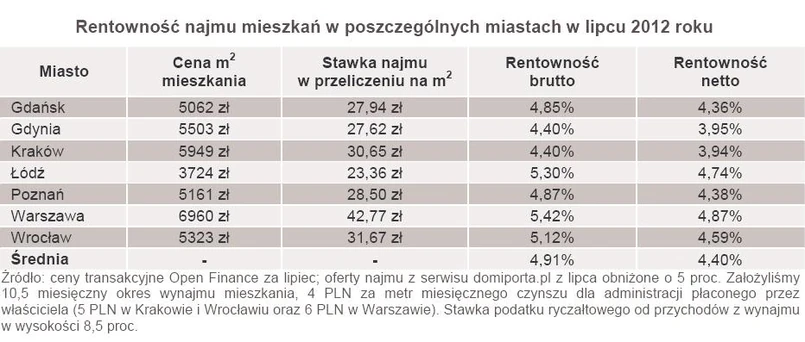 Wpływ turnieju Euro 2012 na rynek wynajmu mieszkań był może i krótkoterminowy, ale jednak wyraźny. Sugeruje to najnowszy odczyt wskaźnika średniej rentowności netto wynajmu, który w lipcu spadł do 4,4 proc. Liczony na bazie ofert wynajmu zamieszczonych w serwisie Domiporta.pl oraz transakcji kupna mieszkań dokonywanych przez klientów Open Finance wskaźnik, przed dwoma miesiącami osiągnął poziom 4,64 proc., a jeszcze dwa miesiące wcześniej, czyli w marcu, było to 4,57 proc. Niemniej cały czas sytuacja wynajmujących jest lepsza niż analogicznym okresie roku ubiegłego, kiedy to średnią rentowność podliczyliśmy na 4,09 proc.