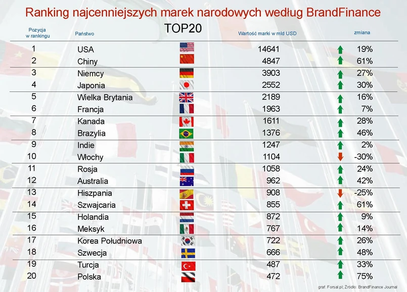 Wartość marki Chin wzrosła w ostatnim roku o 61 proc. do 4,8 bln dol. Państwo Środka awansowało tym samym na drugą pozycję w tegorocznym rankingu, spychając Niemcy na ostatnie miejsce na podium (wartość marki sięga teraz 3,9 bln dol.).