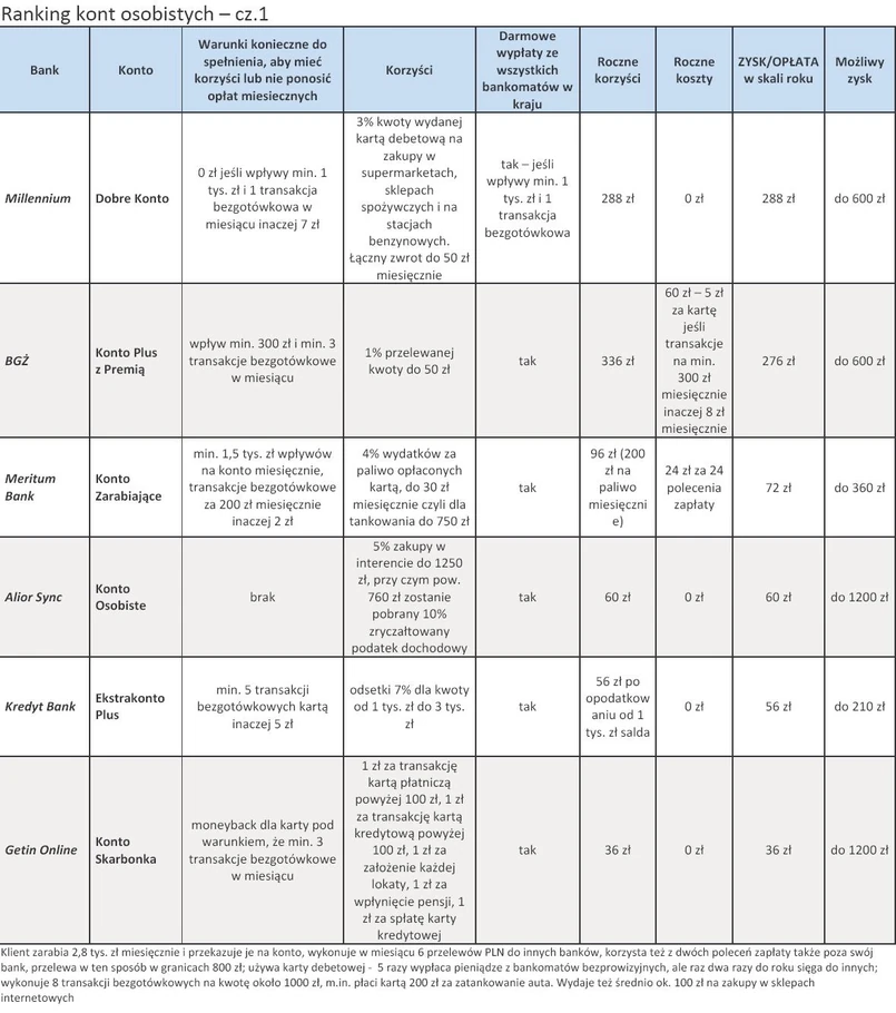 Nasz zainteresowany znalezieniem najatrakcyjniejszego ROR-u zarabia 2,8 tys. zł miesięcznie netto i tyle wpływa na jego konto. Nie boi się bankowania w internecie. Wykonuje operacje wyłącznie w sieci, ale niezbyt często. W ciągu miesiąca robi sześć przelewów złotowych do innych banków, korzysta też z dwóch poleceń zapłaty, również poza swój bank. Łącznie przelewa w ten sposób w granicach 800 zł miesięcznie. Używa karty debetowej - pięć razy w miesiącu wypłaca pieniądze z bankomatów, wyłącznie tych bezprowizyjnych, ale raz dwa razy do roku sięga do innych. Nie jest to jednak szczególne wyzwanie dla ofert banków, bo większość z prezentowanych kont daje możliwość bezpłatnego korzystania ze wszystkich bankomatów w kraju, albo przynajmniej z szerokiej sieci. „Nasz” klient coraz chętniej płaci też kartą w sklepach i punktach usługowych, wykonuje osiem transakcji bezgotówkowych w miesiącu na kwotę około 1000 zł, m.in. płaci kartą za tankowanie auta – przyjęliśmy, że 200 zł. Wydaje też średnio miesięcznie około 100 zł na zakupy w sklepach internetowych.