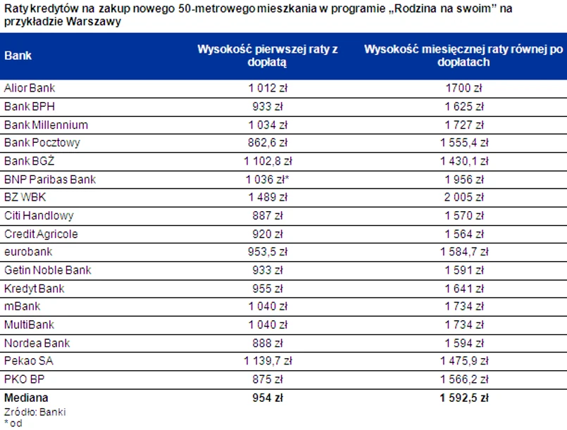 Tyle mówią średnie. Warto jednak zauważyć, że oferty poszczególnych banków przedstawione modelowej rodzinie są mocno zróżnicowane. Rata kredytu z dopłatą dla przyjętych założeń w ofercie najkorzystniejszej i najmniej korzystnej mogłaby różnić się nawet o 626,4 zł – wynika z informacji przesłanych przez banki. Najwyższą ratę w „Rodzinie na swoim” przy zakupie 50-metrowego mieszkania w Warszawie o cenie 295,2 tys. zł zaproponował BZ WBK. Pierwszą ratę oszacował na 1 489 zł. Na drugim biegunie jest Bank Pocztowy. W nim modelowa rodzina mogłaby liczyć na ratę na poziomie 862,6 zł.
