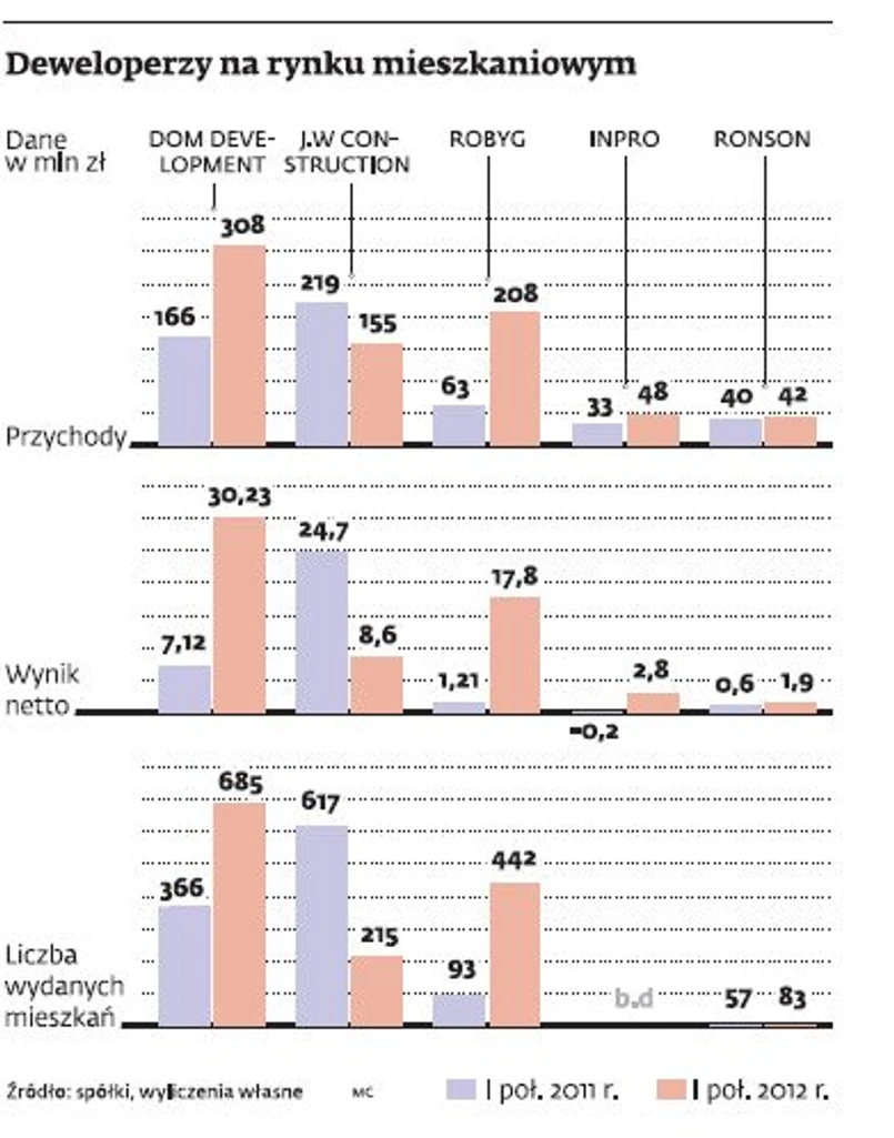 Jednak na razie nie widać tego w ich wynikach. Łączny zysk netto Dom Development, J.W. Construction, Robyga, Inpro i Ronsona wyniósł w I połowie tego roku 61,3 mln zł. Był o ponad 83,7 proc. lepszy niż przed rokiem.