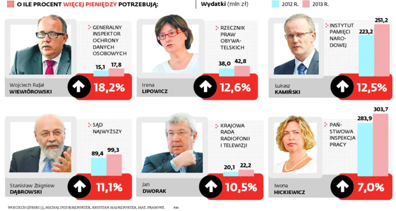 Absolutnym liderem pod względem procentowego wzrostu planowanych wydatków jest generalny inspektor ochrony danych osobowych. Jego budżet miałby się zwiększyć z 15,06 mln zł w tym roku do 17,8 mln zł w przyszłym. To oznacza wzrost o niemal 20 proc. Rekordzistą pod względem wzrostu nominalnego jest Instytut Pamięci Narodowej, który na działalność w przyszłym roku chce dostać 251,2 mln zł, podczas gdy w tym dysponuje 223,2 mln zł.