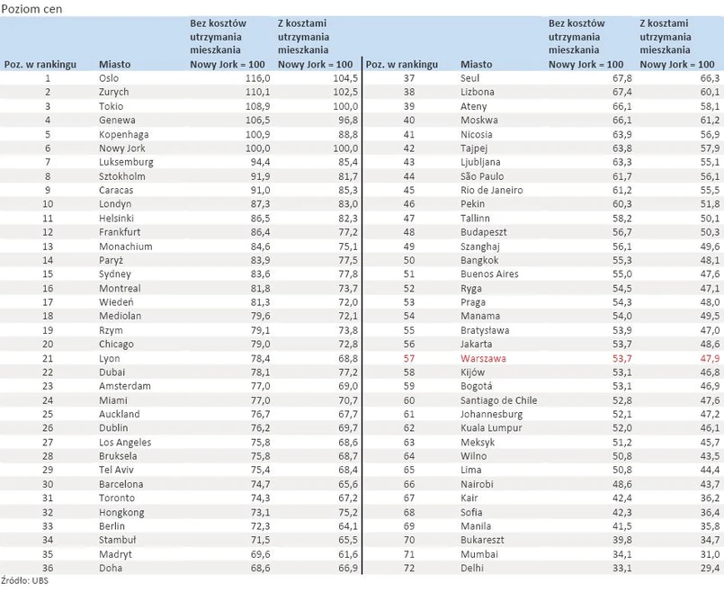Warszawa jest na 57. w rankingu najdroższych miast, wyprzedziła m.in. Kijów, Bogotę, Limę i Kair. Pod względem zarobków znalazła się na 51. miejscu. Siła nabywcza pieniądza jest tu mniejsza niż w większości miast – w tej klasyfikacji Warszawa znalazła się na 54. miejscu.