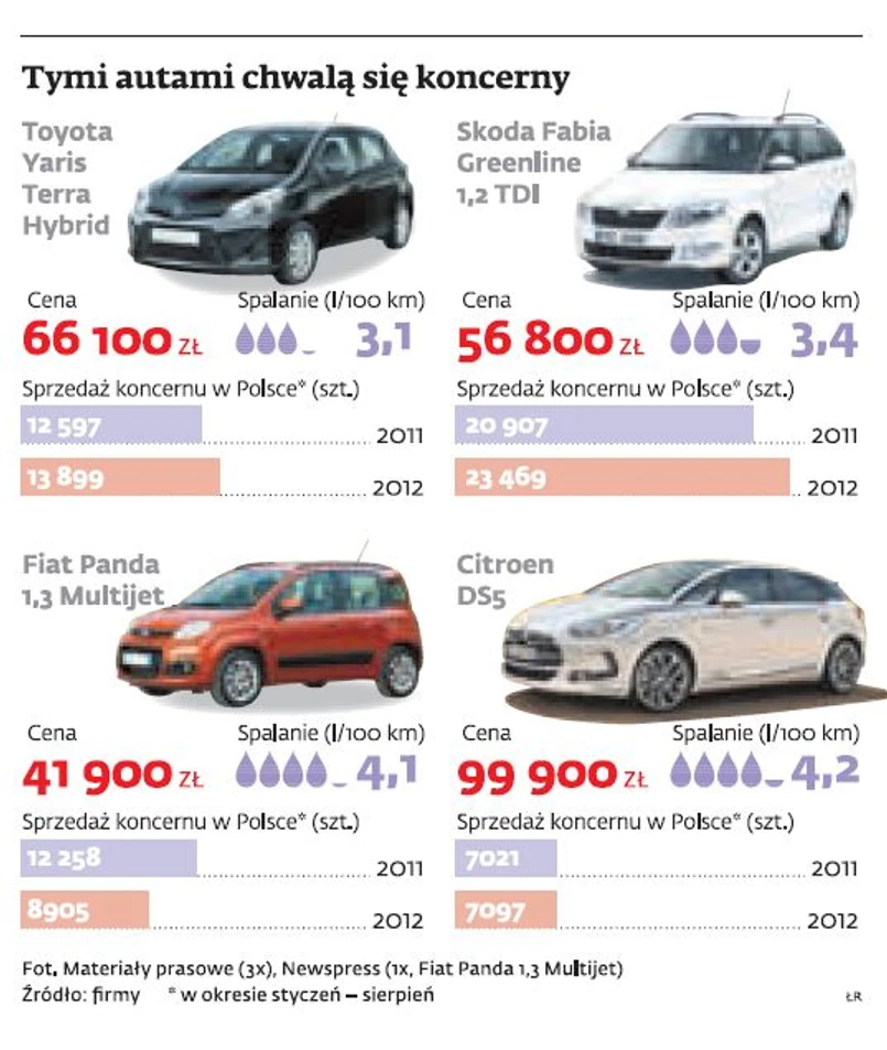Wśród najbardziej oszczędnych aut o ile Ampera i DS5 kosztują grubo ponad 100 tys. zł, o tyle Yaris Hybrid można już mieć za 66 tys. zł. Jak przekonuje Robert Mularczyk z Toyota Motor Poland, to m.in. dlatego pierwsza partia zamówionych aut sprzedała się niemal na pniu. Jednak o 10 – 20 tys. zł mniej można wydać za porównywalnie oszczędne, choć niehybrydowe auta w salonach Citroena, Peugeota czy Fiata. – Przynajmniej sześć oferowanych przez nas modeli zużywa mniej niż 4 l na 100 km – zapewnia Dorota Pajączkowska z Peugeot Polska.