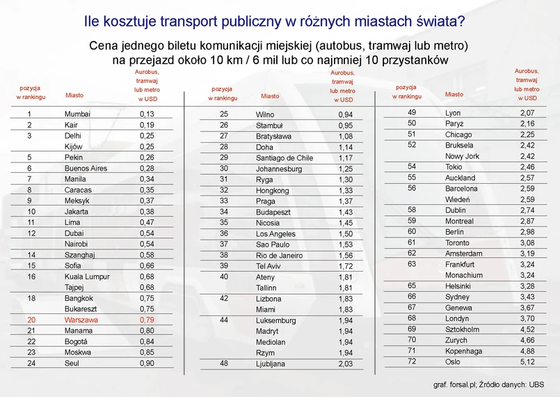 Raport szwajcarskiego banku UBS, który zawiera rankingi cen dóbr i usług w największych metropoliach na całym świecie, mógłby służyć za przewodnik turystyczny. Ciekawe jest zestawienia na temat kosztów transportu publicznego w światowych metropoliach.