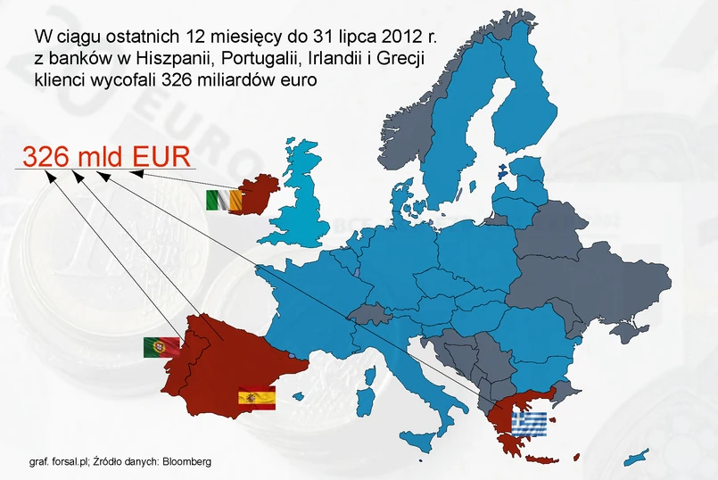 W ciągu ostatnich 12 miesięcy do 31 lipca tego roku z banków w Hiszpanii, Portugalii, Irlandii i Grecji klienci wycofali 326 miliardów euro – wynika z danych zebranych przez Bloomberga.