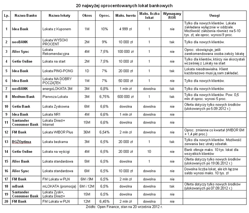 Wydaje się ,że uciążliwe dla klientów ograniczenia oraz wymagania przy zakładaniu lokat dotyczą zwykle ofert z najwyższymi odsetkami. Nie oznacza to jednak, że banki, które płacą niższe odsetki oferują krystalicznie przejrzyste oferty. Za nowe środki więcej na lokatach płacą również takie instytucje jak chociażby BZ WBK czy PKO BP.