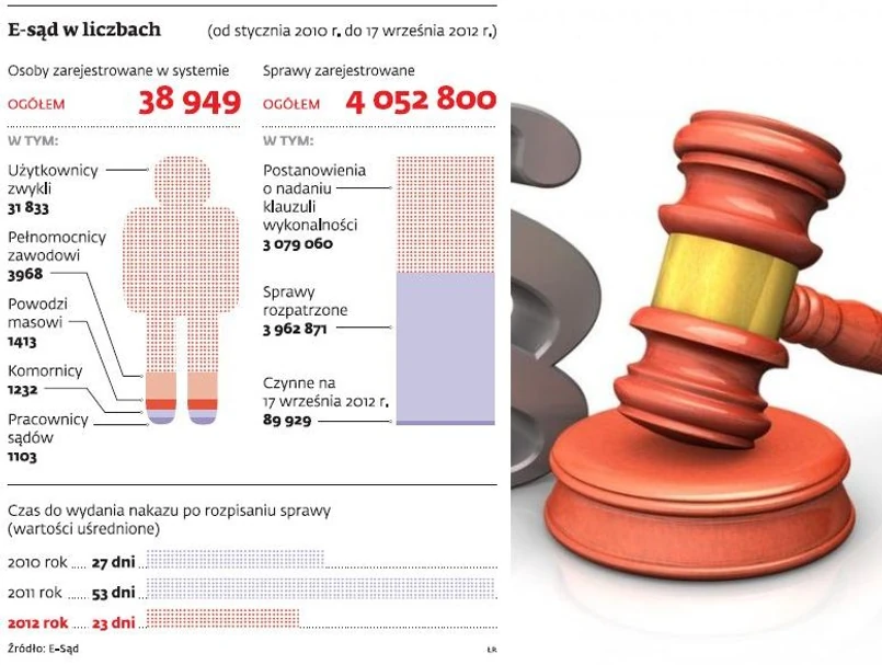 W momencie powstawania e-sądu Ministerstwo Sprawiedliwości szacowało, że docelowo do wydziału tego wpływać będzie ok. 600 tys. spraw rocznie. Jak się okazało, już w pierwszym roku wpłynęło 690 109 spraw. W roku 2011 nastąpiło prawdziwe oblężenie – drogą elektroniczną skierowanych zostało 1 856 839 spraw, czyli ponad trzykrotnie więcej, niż przewidywano. W roku bieżącym przyrost liczby zgłaszanych spraw nie będzie już tak duży, jednak do połowy września zarejestrowanych było ich już 1 505 753. Efektem ubocznym są sytuacje, w których system nie daje rady sprostać tak dużemu zainteresowaniu.