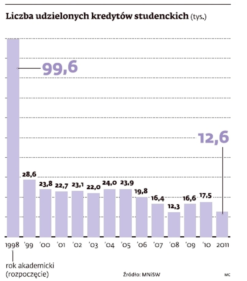 Z systemu preferencyjnych kredytów korzysta dziś mniej niż 5 proc. wszystkich studentów. W minionym roku akademickim cztery banki: Pekao, PKO BP, SGB i BPS, udzieliły jedynie 12,6 tys. takich kredytów. I nic nie wskazuje na to, aby w kolejnym, rozpoczynającym się już za tydzień, było ich znacząco więcej. Najważniejszą przyczyną nikłego zainteresowania ze strony uczących się jest konieczność przedstawienia zabezpieczenia, co dla młodych ludzi jest sporym wyzwaniem.