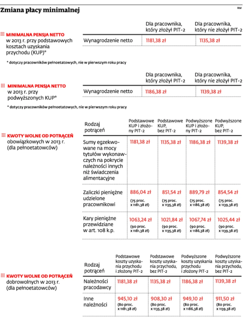 Podwyżka płacy minimalnej wpłynie także na wysokość kwot, jakie mogą być potrącane z wynagrodzenia. Zgodnie z art. 87 k.p. pracodawca ma prawo potrącać z wynagrodzenia za pracę m.in. sumy egzekwowane na zaspokojenie świadczeń alimentacyjnych. Pracodawca musi jednak pozostawić pracownikowi kwotę wolną od potrąceń. Przy alimentach jedyne ograniczenie to 3/5 wynagrodzenia netto, bez względu na to, ile faktycznie zostanie zatrudnionemu. W pozostałych przypadkach kwota wolna jest powiązana z płacą minimalną (patrz tabela).