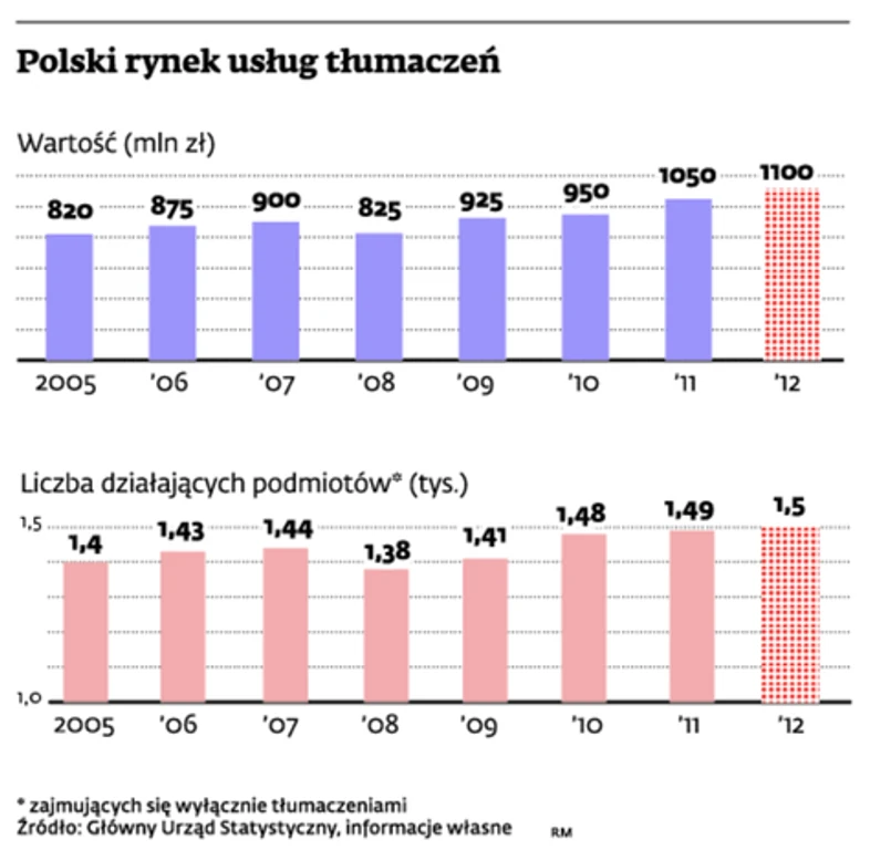 Ostatnia dekada dla firm zajmujących się tłumaczeniami biur była bardzo korzystna. Z wyjątkiem ponurego roku 2008, kiedy zarówno liczba podmiotów, jak i wartość zlecanych tłumaczeń spadła, rynek rozwijał się w tempie około 7 – 10 proc. rocznie. W ubiegłym roku, jak szacuje Polskie Stowarzyszenie Biur Tłumaczeń (PSBT), wyceniany był na mniej więcej miliard zł. W 2012 r., jak przewidują specjaliści, firmy wydadzą na tłumaczenia o ok. 100 mln zł więcej niż rok wcześniej.