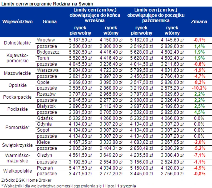 Już dziś wiadomo ponadto, że od października limity cen kwalifikujące do dopłat wzrosną w Białymstoku, Rzeszowie, Bydgoszczy i Toruniu. W większości tych miast zmiany nie przekroczą istotnie poziomu 2%. Od poniedziałku limit dla rynku pierwotnego wyniesie w Białymstoku 3987 zł, w Rzeszowie 3787 zł, a w Toruniu i Bydgoszczy 5628 zł za metr.