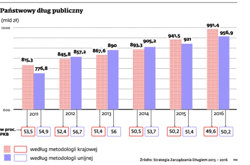 Ministerstwo Finansów musiało na nowo policzyć swoje prognozy wielkości długu m.in. dlatego, że zmieniły się założenia wzrostu gospodarczego w najbliższych latach. Resort uważa, że gospodarka w przyszłym roku będzie rozwijała się w tempie 2,2 proc. i nieznacznie przyspieszy w 2014 r. – do 2,5 proc. PKB. Dopiero od 2015 r. przyspieszenie będzie ostrzejsze, wyniesie około 3,5 proc. To wyraźne pogorszenie prognoz w porównaniu do poprzedniej edycji strategii. Efektem są nowe szacunki wielkości długu – ma on spaść poniżej 50 proc. PKB dopiero w 2016 r.