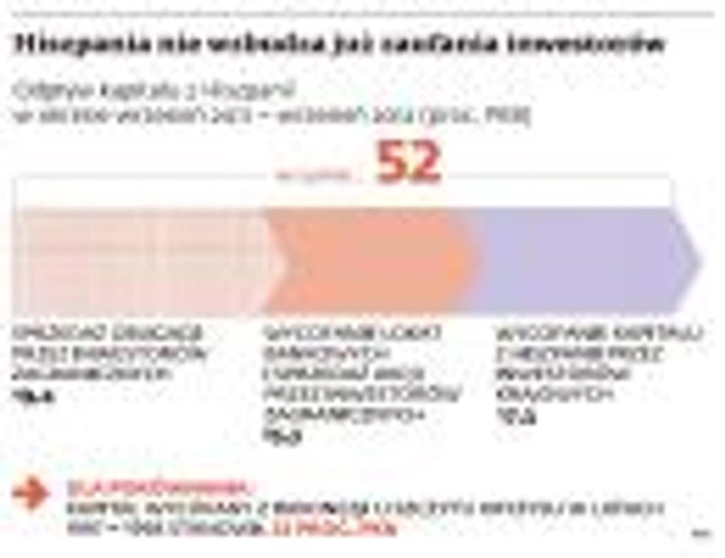Ich główną obawą jest to, że w razie rozpadu strefy euro ich oszczędności radykalnie stracą na wartości, bo zostaną przeliczone na pesety – tłumaczy Tobias Blattner z Daiwa Capital Markets w Londynie. Inną przyczyną wyprowadzania funduszy z Hiszpanii jest także coraz większa emigracja z kraju, w którym bezrobocie sięga 25 proc. W minionym roku tylko do Wielkiej Brytanii wyprowadziło się prawie 100 tys. Hiszpanów, najczęściej zabierając ze sobą całe oszczędności. Dane Nomury potwierdzają liczby podane przez Bank Hiszpanii, które nie obejmują inwestycji w obligacje skarbu państwa. Wynika z nich, że fundusze wycofane z depozytów bankowych oraz giełdy i transferowane za granicą w okresie styczeń – lipiec wyniosły 235 mld euro wobec nadwyżki 18 mld euro w tym samym okresie poprzedniego roku.