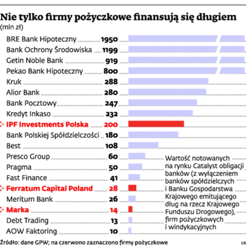 Spółka Ferratum Capital Poland wyemitowała w ubiegłym roku obligacje o wartości nominalnej 28 mln zł, które są notowane na rynku Catalyst. Całkowita wartość trzyletniego programu emisji (rozpoczętego w połowie 2011 r.) to 250 mln zł. Ferratum poszło w ślady największej na naszym rynku firmy pożyczkowej Provident, która sprzedała inwestorom papiery dłużne o wartości 200 mln zł. Provident należy do brytyjskiej grupy International Personal Finance. Na Catalyście znajdują się również papiery Marki, kolejnej spółki, która zajmuje się udzielaniem niewielkich, wysoko oprocentowanych pożyczek dla klientów indywidualnych.