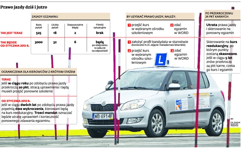 Nowe zasady zakładają m.in. zwiększenie bazy pytań do ok. 3 tys., z czego część stanowić będą interaktywne filmy sytuacyjne z 10-sekundowym czasem na odpowiedź. Z kolei kierowcy, którzy zbiorą 24 punkty karne, nie będą kierowani na powtórny egzamin, tak jak obecnie. Zamiast tego czeka ich wielogodzinny kurs doszkalający. Problem w tym, że rewolucja w egzaminach jest zagrożona. Oto powody, które niemal gwarantują poślizg.