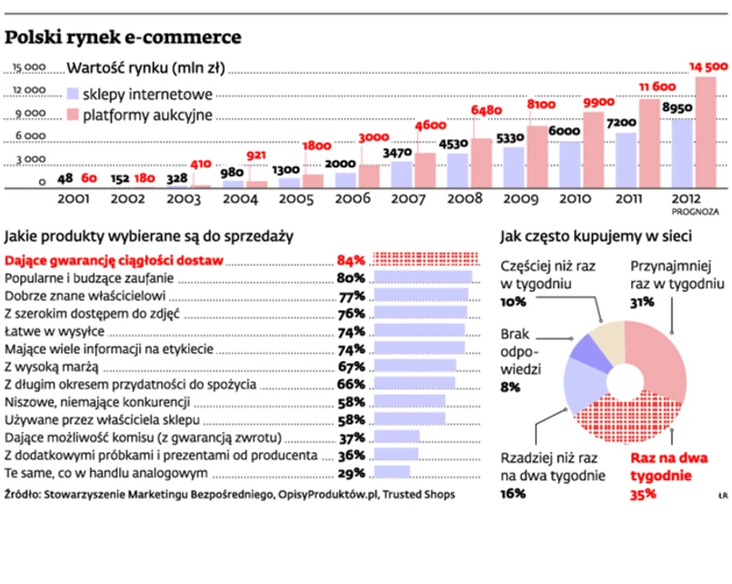Nikt nie ma wątpliwości, że e-commerce przynajmniej w tym i przyszłym roku będzie najszybciej rozwijającą się gałęzią krajowego handlu. Według ostatniego raportu firmy Centre Retail Reaserch, zajmującej się badaniem aktywności w internecie w 2011 r. na zakupy w sieci (zarówno w e-sklepach, jak i na platformach aukcyjnych) Polacy wydali rekordową kwotę 4,5 mld euro (prawie 19 mld zł). Z badań wynika, że mimo trudniejszego okresu w gospodarce aż 40 proc. placówek zwiększyło obroty, a jedna trzecia – zyski.