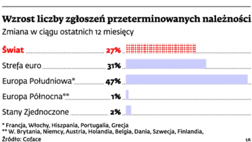 W ciągu ostatniego roku ubezpieczyciel należności Coface zauważa wyraźne pogorszenie zachowań płatniczych przedsiębiorstw, wyrażane wzrostem poziomu niespłaconych należności. Firma zarejestrowała zwiększenie liczby zgłoszeń przeterminowanych należności na świecie średnio o 27 proc. Wzrost był najbardziej odczuwalny dla przedsiębiorstw z Europy Południowej (o 47 proc.). Świadczy to o zdecydowanym pogorszeniu średniej siły firm. Paradoksalnie – kryzys odbija się rykoszetem na przedsiębiorstwach zarządzanych teraz lepiej niż kiedykolwiek, bo bogatszych o doświadczenia ostatnich kilku lat.