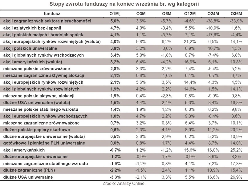 Dzięki deklaracjom szefów Europejskiego Banku Centralnego i amerykańskiego Fed, zapewniającym o ich gotowości do dalszego pompowania pieniędzy w słabnące gospodarki, inwestorzy, a w tym posiadacze funduszy inwestycyjnych, mogą wrzesień zaliczyć do udanych. Podobnie jak miesiąc wcześniej, zdecydowana większość spośród blisko 400 monitorowanych przez nas funduszy otwartych, dla których walutą rozliczeniową jest złoty, zakończyła wrzesień na plusie. Straty zanotowało jedynie 13 proc. z nich.
