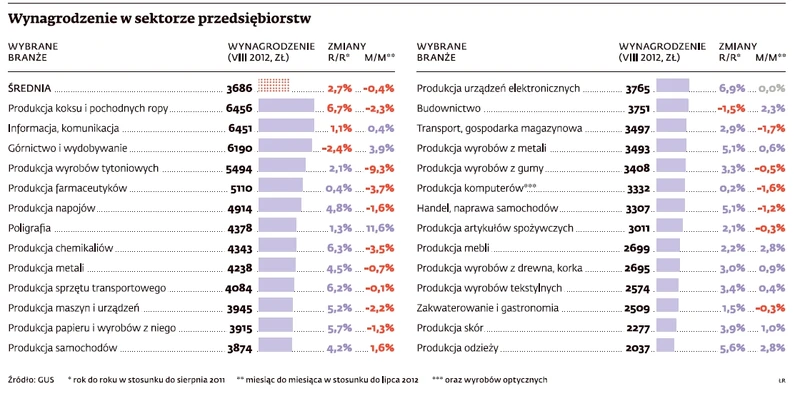 Sektor cierpi na brak zamówień. W konsekwencji w tym roku jest w czołówce pod względem zwolnień pracowników. I ogranicza wynagrodzenia. Choć średnie – 3751 zł miesięcznie, nadal jest lekko powyżej przeciętnej krajowej, to zawyża je dochód nielicznej (w stosunku do ogółu) kadry inżynierskiej, pracującej głównie przy drogach. Producenci komputerów, wyrobów optycznych, farmaceutyków oraz osoby pracujące w informacji i komunikacji choć nie doznały nominalnego spadku wynagrodzeń, to także niemal nie miały podwyżek. W informacji i komunikacji, gdzie wysokość dochodów znacznej części pracowników zależy od sprzedaży, to efekt nasycenia rynku i dużej konkurencji. Jednak ta branża, obok wydobywczej, jest w ścisłej czołówce dochodów: średnio 6450 zł.