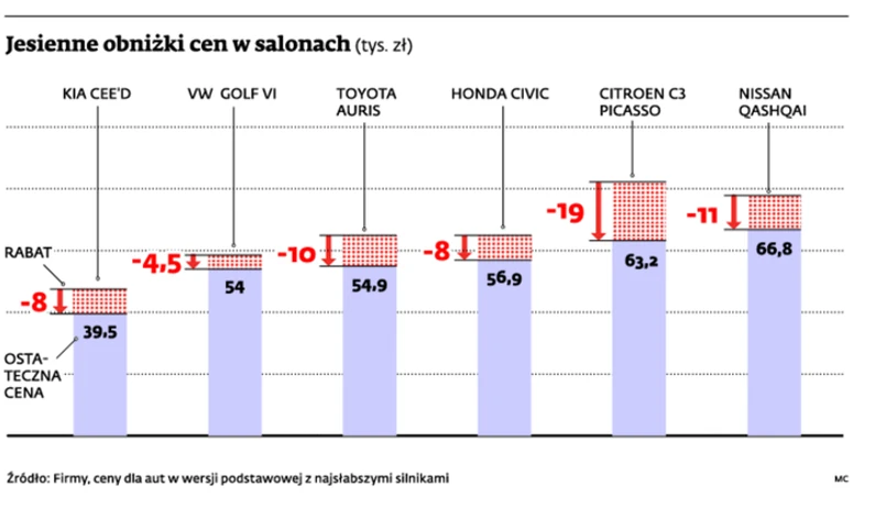 Nie czeka natomiast inny francuski koncern. Citroen już przecenił modele C3 i C4 Picasso o 18 – 19 tys. zł. Duże upusty oferuje też Nissan. Na cieszący się dużą popularnością wśród Polaków model Qashqai japoński koncern proponuje 11 tys. rabatu. Na promocji cenowej nie oszczędza też Honda. Najpopularniejszy w palecie model Civic firma przeceniła o 8 tys. zł. O taką samą kwotę obniżyła też cenę Cee’da koreańska Kia.
