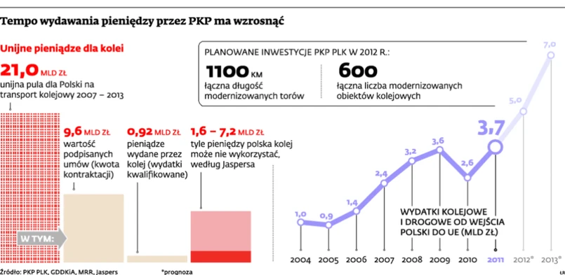 Z 21 mld zł dotacji na kolej w ramach budżetu 2007 – 2013 trzeba rozliczyć się do 2015 r., w przeciwnym wypadku pieniądze przepadną – przepowiadają branżowi eksperci. Według Ministerstwa Rozwoju Regionalnego w budżecie 2007 – 2013 PKP zakontraktowały projekty na 47 proc. dostępnej kwoty, a wydały tylko 4,5 proc. Kolejarzom grunt pali się pod nogami. DGP poznał niektóre triki PKP umożliwiające szybką ścieżkę inwestycyjną.