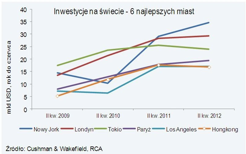 Zwycięzcą zestawienia już drugi raz z rzędu okazał się Nowy Jork – inwestycje zwiększyły się tu o 17,5 proc. do 34,7 mld dol., tuż za nim znalazł się Londyn (wzrost o 2,4 proc. do 29,3 mld dol.), a trzecie miejsce zajęło Tokio (23,9 mld dol., spadek o 7,6 proc.). Pierwszą szóstkę zamykają Paryż, Los Angeles i Hongkong.