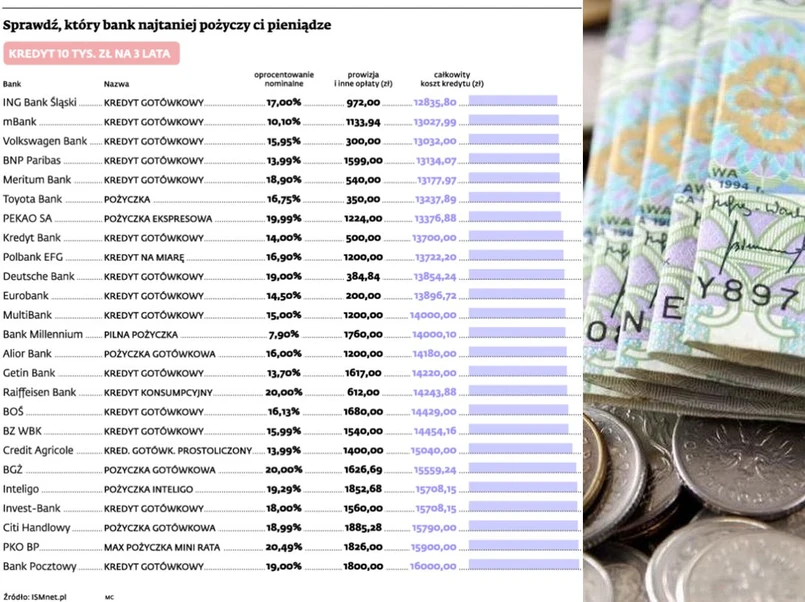 Najważniejsze z tych kosztów to oczywiście oprocentowanie. Instytut ISMnet.pl przygotował dla nas zestawienie kredytów gotówkowych i ich kosztów. Pod uwagę wzięto ofertę dla kredytobiorcy o dochodach 3,5 tys. zł netto, który chce pożyczyć 10 tys. zł na 3 lata. Z zestawienia wynika, że dla naszego hipotetycznego klienta nominalne oprocentowanie pożyczek gotówkowych wahać się będzie od 7,9 proc. (takie oferuje Bank Millennium) do ok. 20 proc. (BGŻ, PKO BP i Raiffeisen). Najwięcej ofert mieści się w przedziale między 14 a 18 proc. w skali roku.