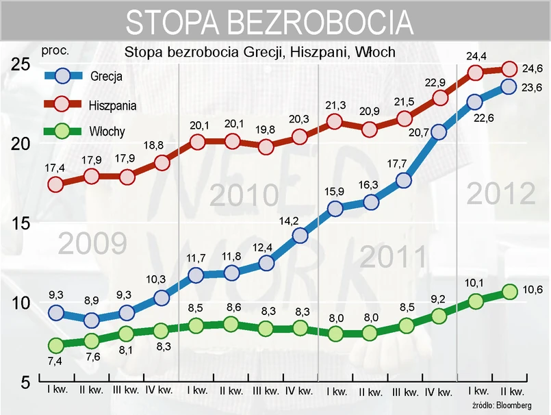 Włoski rynek pracy nie jest w tak opłakanej sytuacji jak w Hiszpanii. Bezrobocie sięga tu obecnie prawie 12 proc., ale rośnie od połowy 2011 roku - głównie z powodu trudności ze znalezieniem pracy wśród młodych. Bezrobotni stanowią ponad 26 proc. młodzieży wieku od 15 do 24 lat. Według prognozy Eurostatu stopa bezrobocia we Włoszech w 2013 roku pozostanie stabilna w 2013 roku i wyniesie 9,7 proc.