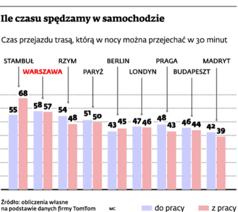 Pod względem średniego czasu przejazdu wyprzedza nas jedynie turecki Stambuł (+57 proc.). Ale już w kategorii „czas przejazdu w porannych godzinach szczytu” jesteśmy liderem rankingu, w którym sklasyfikowanych zostało 58 europejskich miast. Kto pracuje w stolicy, do czasu zakładającego idealną płynność ruchu (często podawanego przez nawigację) powinien doliczać średnio aż 93 proc. Innymi słowy, jeżeli w środku nocy czy w weekend do biura jechałby 30 minut, to w porannych korkach będzie to 58 minut. A popołudniowy powrót do domu będzie krótszy zaledwie o pół minuty.