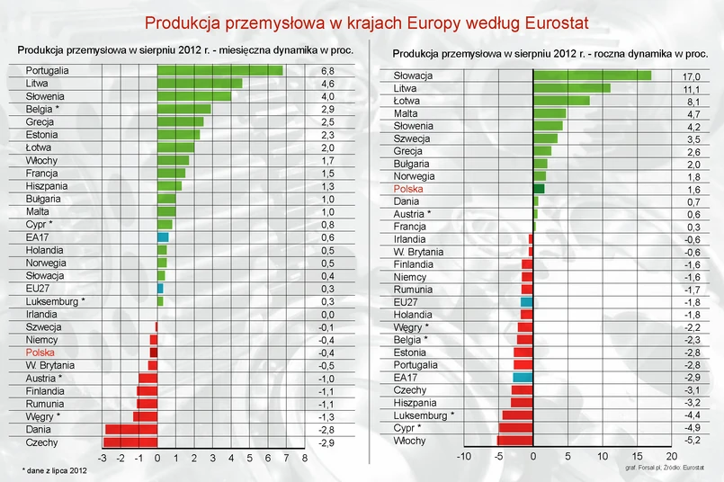 W ujęciu miesięcznym, najmocniejszy wzrost zanotowała produkcja przemysłowa w Portugalii (6,8 proc.), na Litwie (4,6 proc.) oraz na Słowenii (4 proc.) i w Grecji (2,5 proc.). Najgorzej radził sobie przemysł w Czechach (-2,9 proc.), Danii (-2,8 proc.), Rumunii i Finlandii (po -1,1 proc.)