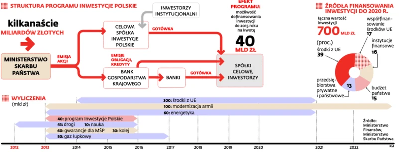 Inwestycje Polskie – 40 mld zł. To najważniejsze narzędzie wspierania wzrostu. Akcje państwowych firm mają trafiać do Banku Gospodarstwa Krajowego lub nowej spółki Inwestycje Polskie. Tam zamieniane na gotówkę służyłyby do przygotowywania poręczeń i kredytów na inwestycje lub ich dofinansowania. – Projekty w systemie partnerstwa publiczno-prywatnego nie działają i obawiam się, że w tej materii niewiele się zmieni. Dobrze, że jest pomysł na wykorzystanie kapitału zamrożonego w akcjach spółek Skarbu Państwa – mówi DGP przedsiębiorca i inwestor Zbigniew Jakubas.