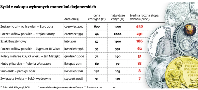 Wielkość nakładu ma duże znaczenie dla cen na rynku wtórnym. Zestaw dwóch srebrnych monet – 10 złotych i 10 hrywien – sprzedawany pierwotnie przez NBP po 600 zł, dziś na aukcjach osiąga ceny rzędu 1000 – 1500 zł. Zestaw czterech monet kosztował w NBP 600 zł – na aukcjach jego cena dochodzi do 850 zł. Pojedyncza moneta srebrna wybita z okazji Euro 2012 w nakładzie 35 tys. sztuk nie przynosi już tak dużych zysków. Jej cena na rynku wtórnym to około 240 zł, o 20 proc. więcej niż cena emisyjna.