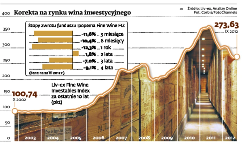 Polskie firmy oferujące możliwość inwestowania w wino przyznają, że ta sytuacja dotknęła ich klientów. Wycena jednostki funduszu Ipopema Fine Wine FIZ w omawianym okresie spadła o 12,5 proc. Ipopema podjęła decyzję o likwidacji funduszu. Średni spadek wartości portfela klienta Stilnovisti Investments w ciągu ostatnich 12 miesięcy wyniósł 5 – 15 proc. – Ale nie zauważyliśmy nasilonego odpływu klientów. Większość słucha naszych rekomendacji dotyczących okresu inwestycji, który powinien wynosić od 3 do 5 lat. A aktualna sytuacja na rynku jest idealna do dokonywania zakupów – twierdzi Krzysztof Maruszewski, szef Stilnovisti Investments.